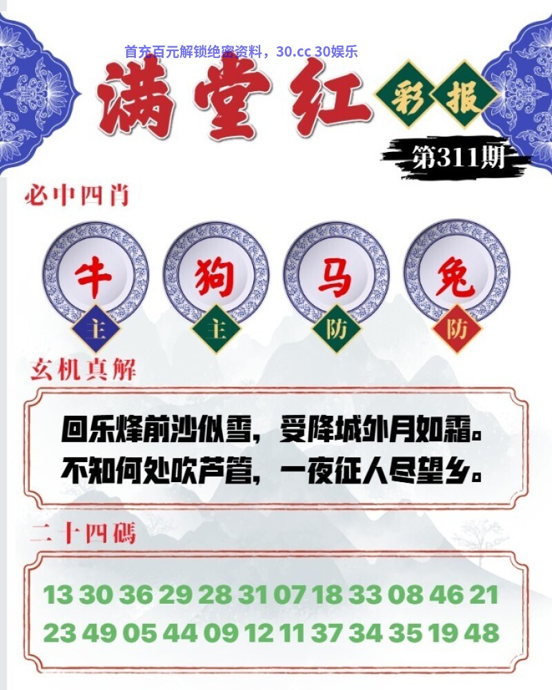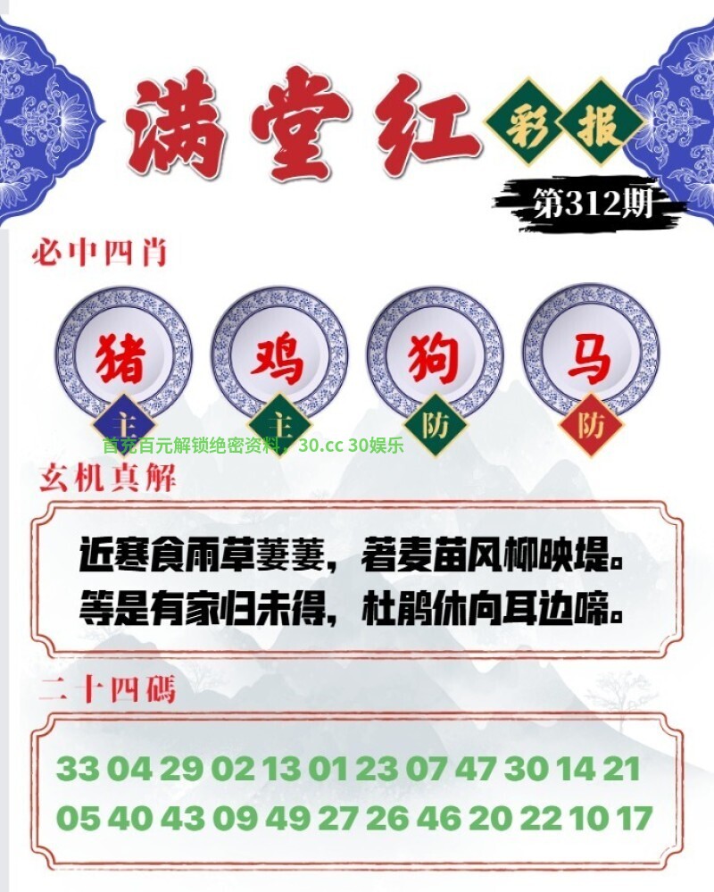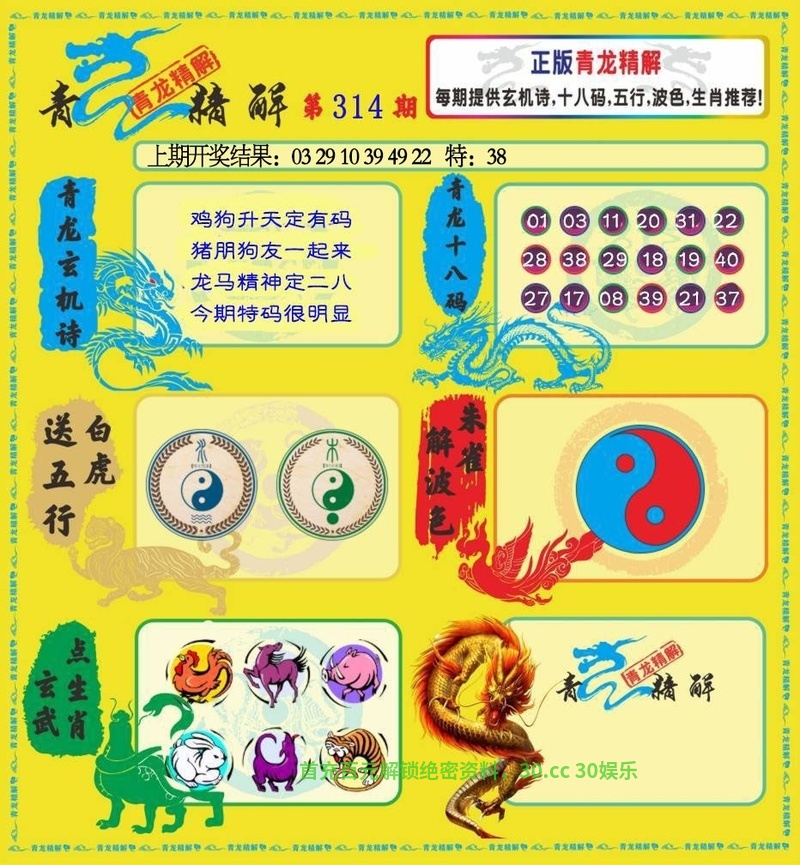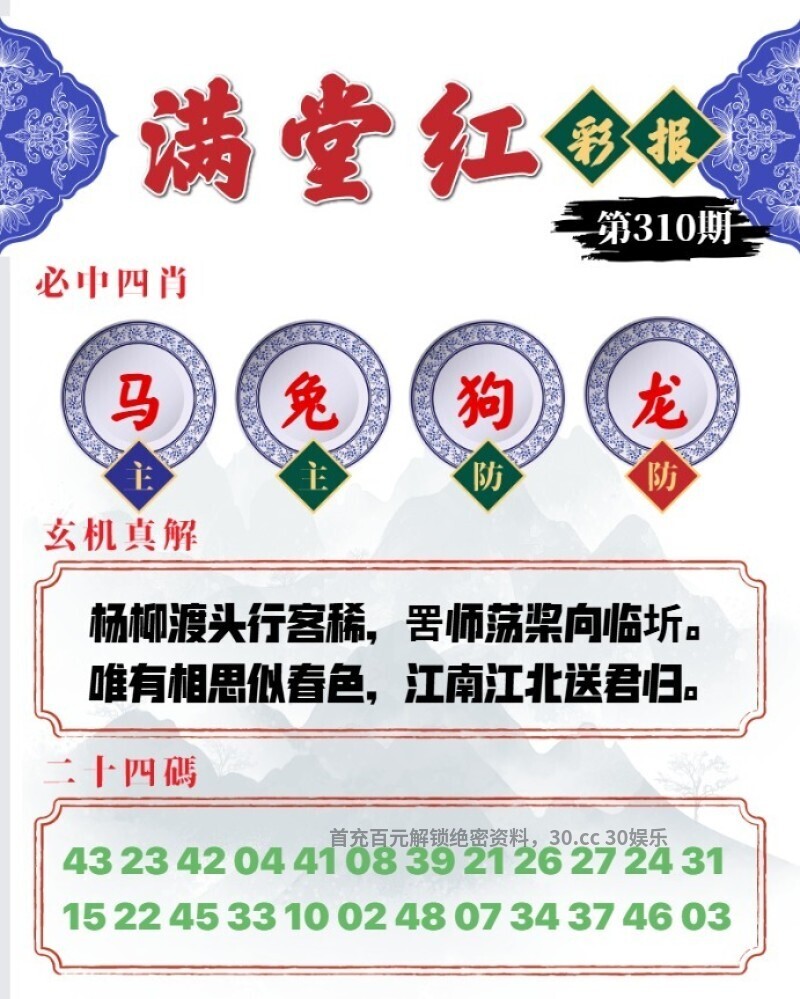 315期:龙门客栈解析 掌柜:時當暮春 小二:客官,马上安排 客官:马三甲,约口嘴 解:時當暮春。解羊蛇兔鼠龙狗 推荐特肖:羊蛇兔鼠龙狗 |
