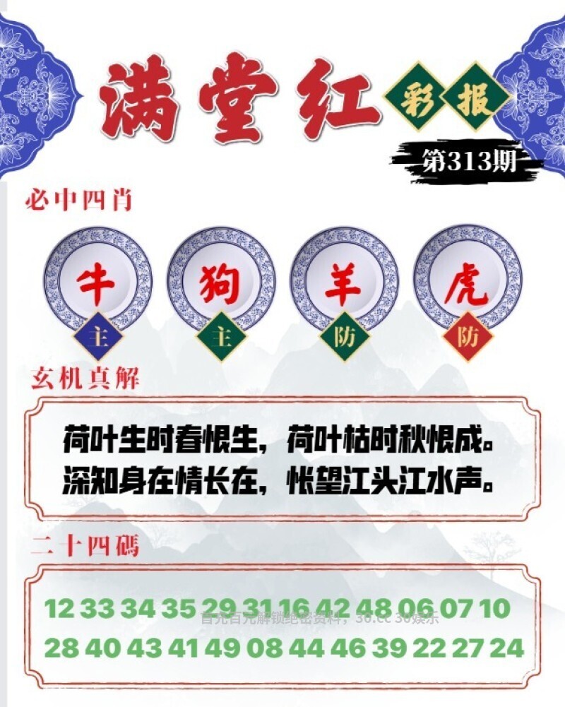 313期满堂红彩报:荷叶生时春恨生,荷叶枯时秋恨成。深知身在情长在,怅望江头江水声。 六肖:马猪龙猴鸡羊 三肖:马猪龙 特码:24.36.07.43.02.38.10.22.21.33.23.35 |